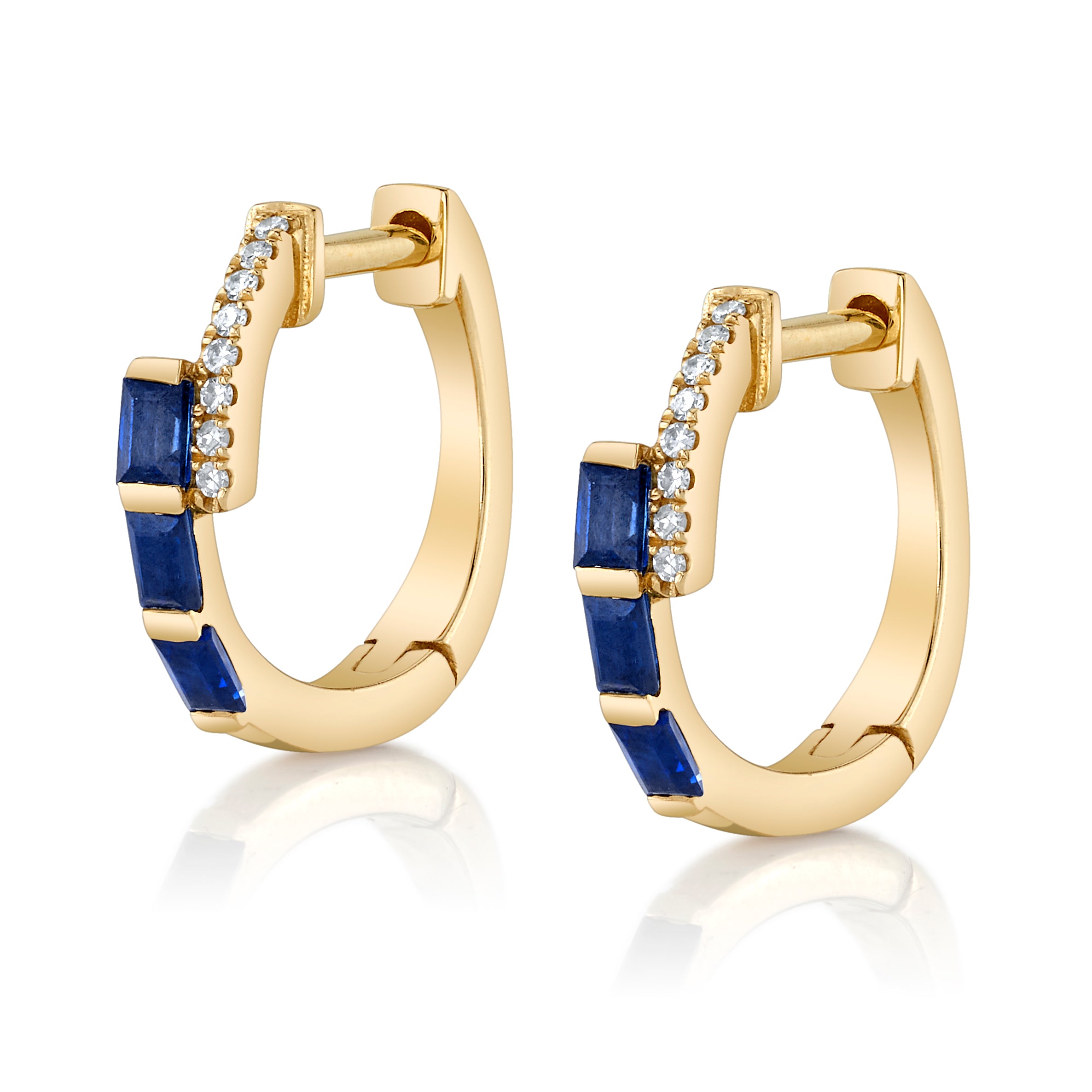 Huggie set in gold. On the bottom detail sits, three baguette blue sapphires. The top of the huggie has pave white diamonds that sit off-center.