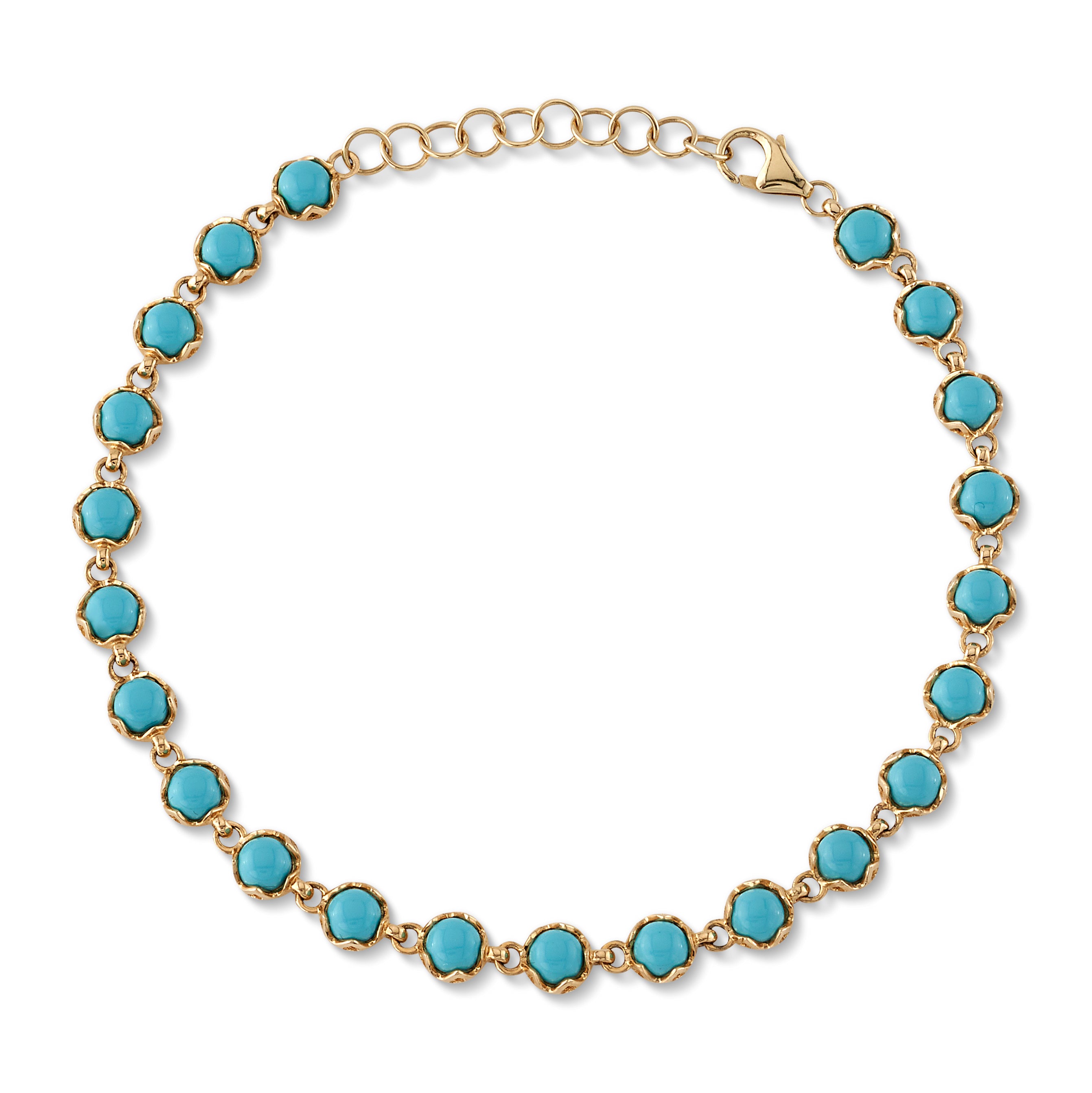 Dainty, scalloped-edge, bezel-set stone bracelet, linked together and set in 14k gold. The bracelet length is 7.25 inches total, including a 1 inch extender. Choose between Turquoise or Opal stones.