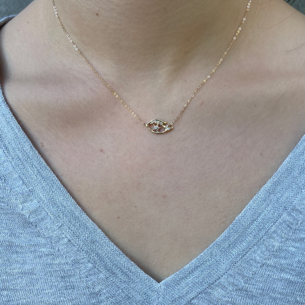 This necklace is a stunning piece that will add a touch of celestial beauty to any outfit. With its delicate eye-shaped design and shimmering diamond eyelashes, it is the perfect accessory for any starry-eyed dreamer. 16 inch length chain.