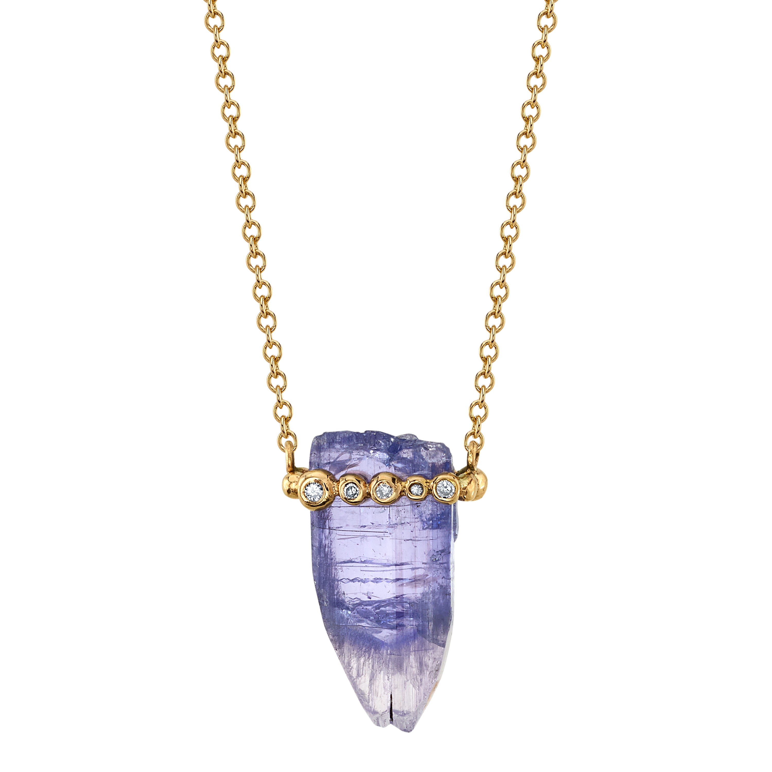 One-of-a-Kind Tanzanite Crystal and Diamond Necklace. Bezeled Diamonds decorate the top and is set in 14k Gold.