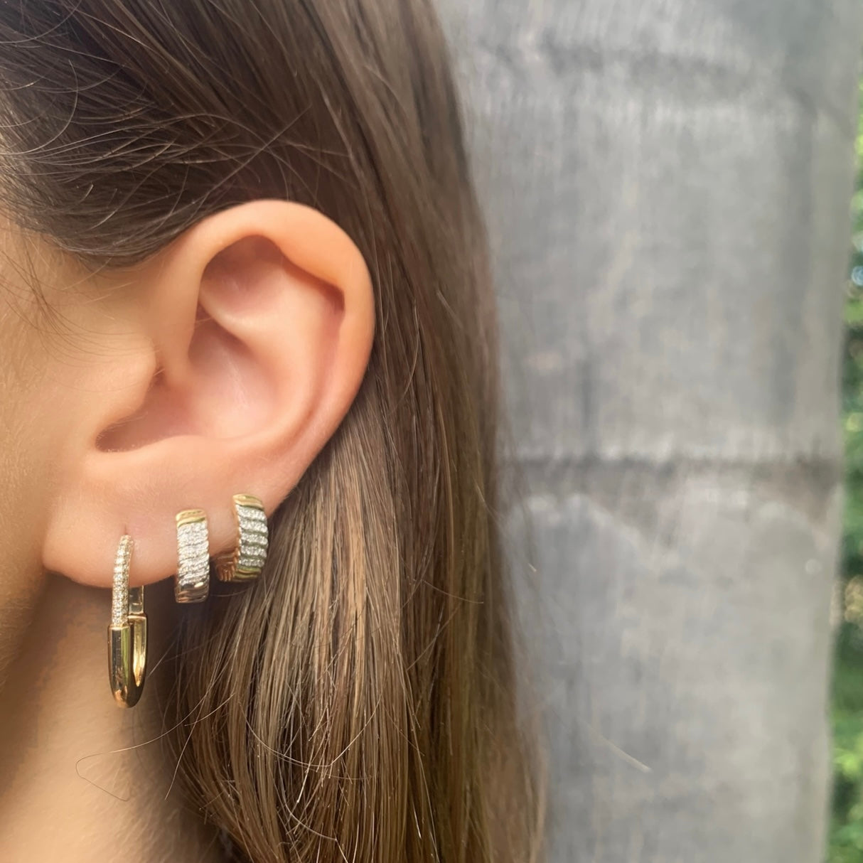 Crafted with 14k yellow Gold and adorned with sparkling diamonds, this huggie adds a touch of texture and elegance to any outfit.