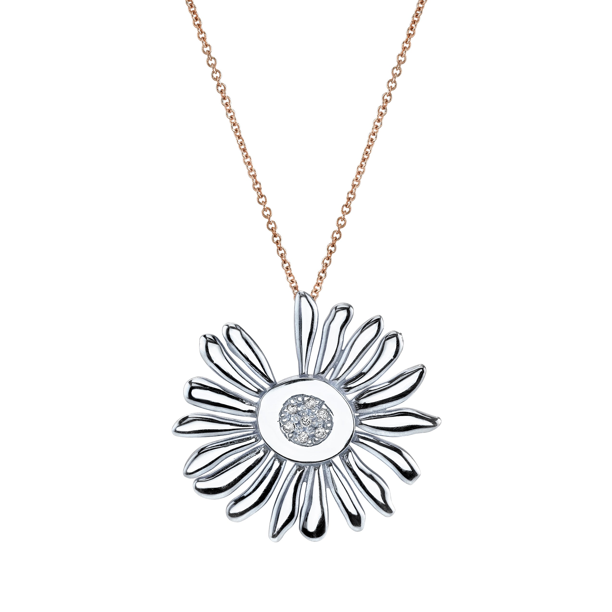 The Daisy Necklace with "Loves Me" petal missing. Seven white Diamonds set in center of the flower and hangs on a 16 inch chain.