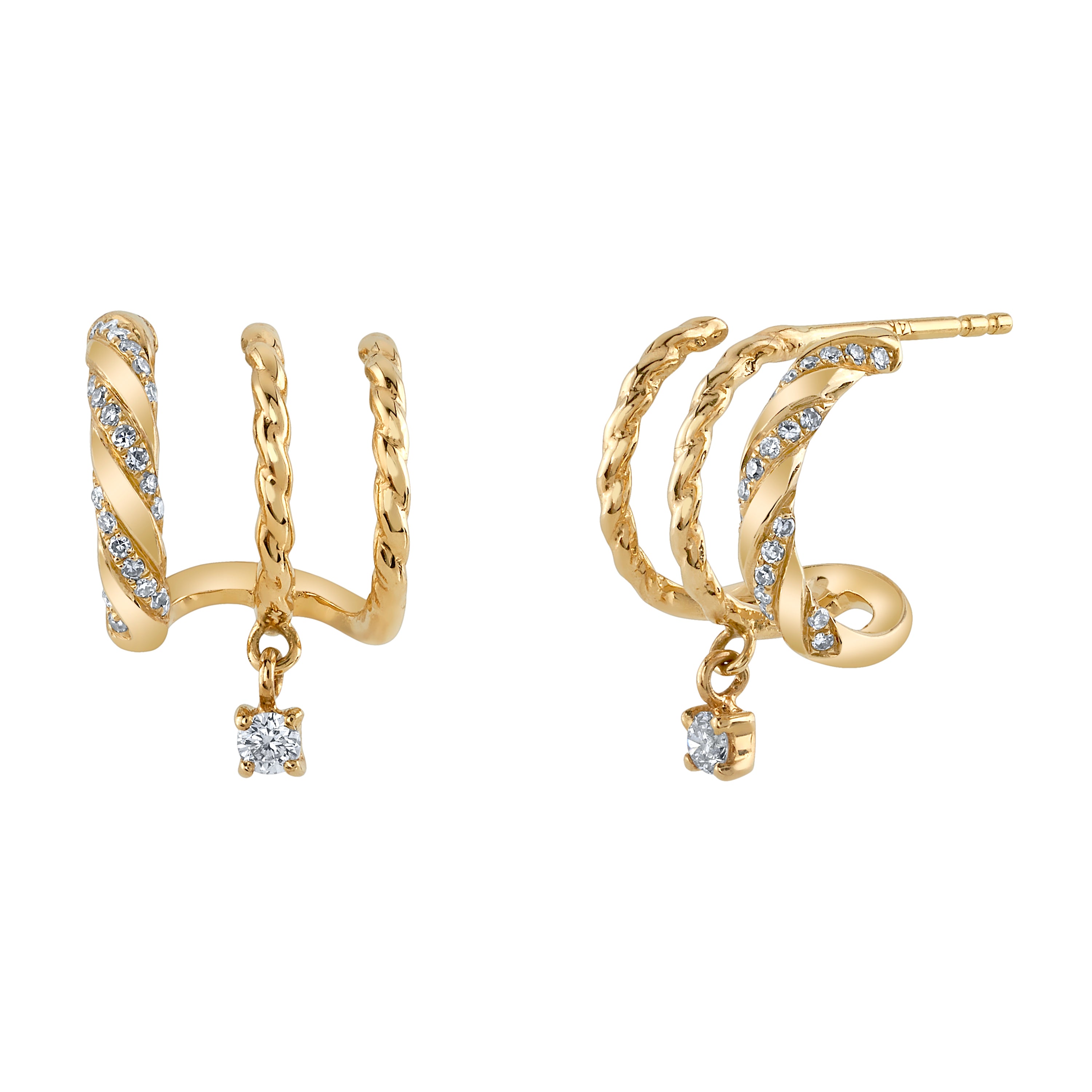 Three-point Half-huggie with a detailed twisted design. On one point is an intertwined with pave white Diamonds. A single prong and bezel set Diamond dangles from the center point.