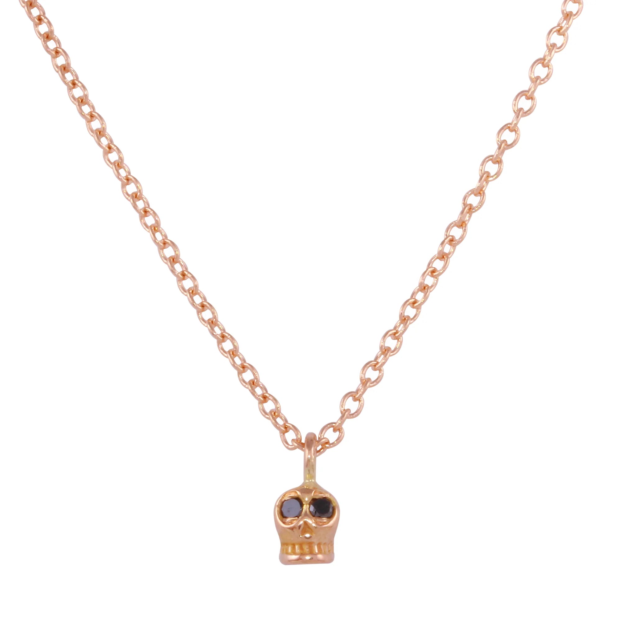 This dainty necklace features a tiny skull hand cast with either white diamond eyes set in yellow gold or black diamond eyes set in rose gold. It gives a slight edge to any outfit while still being cute enough for everyday wear. 3 Millimeter Pendant Height on a 14.5 inch length chain with a 1.5 inch extension.