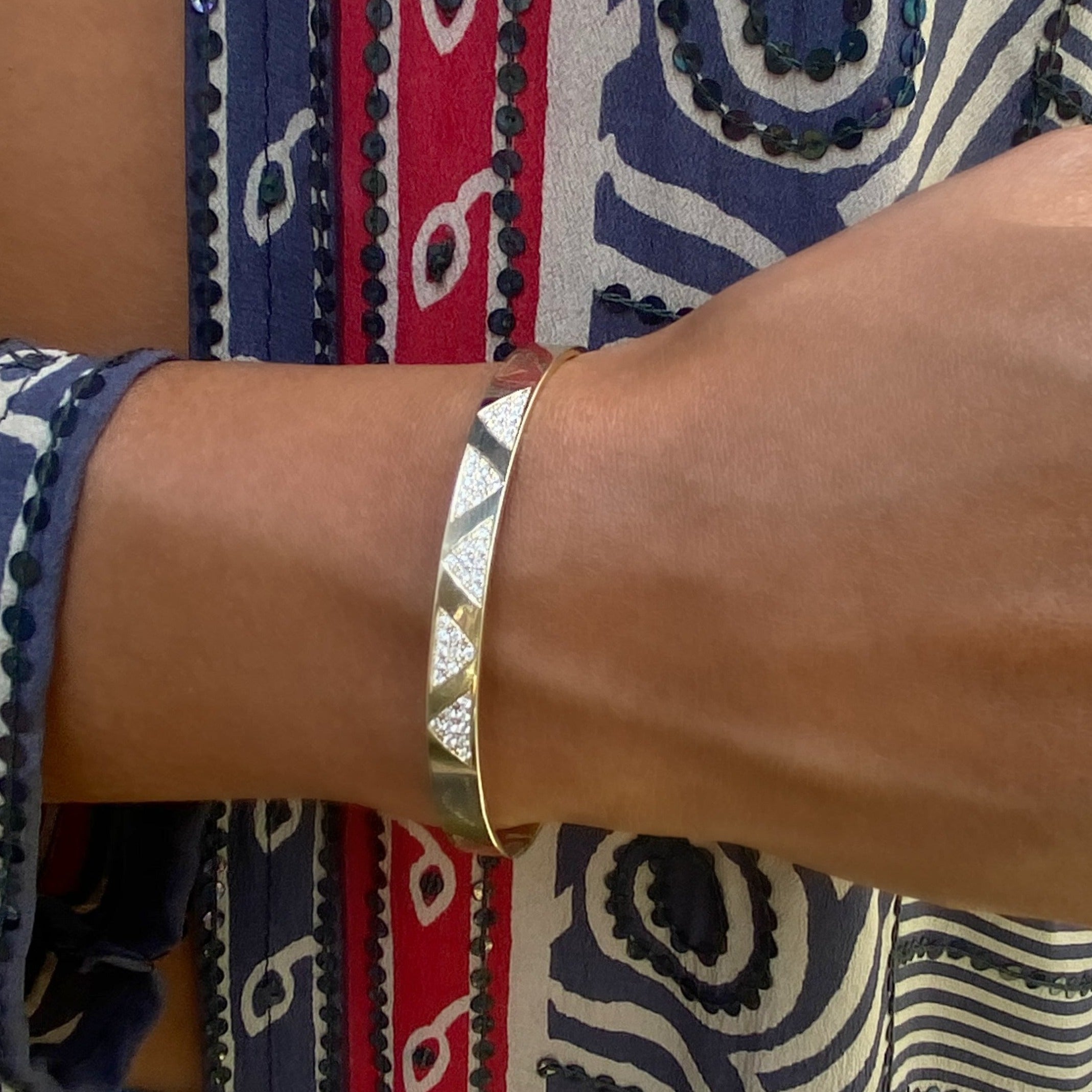 The solid Gold cuff is lovingly hand set with 72 white diamonds inset in five pave diamond triangles. The number Five represents travel and adventure. The triangle is a simple shape but contains a profound meaning which symbolizes strength. Bracelet: .5 inch Width.