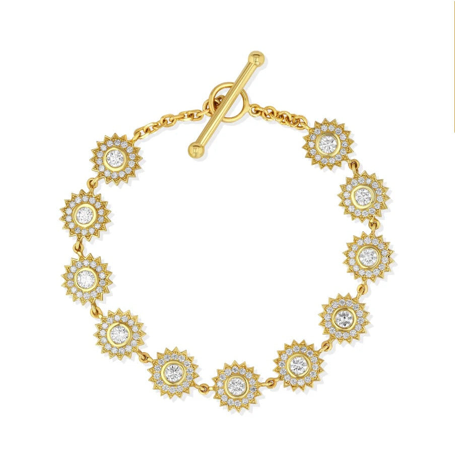 The Twilight Star Diamond Bracelet. Diamond captures the stillness and shimmer of the night sky. Each star, set entirely with white Diamonds, links seamlessly to the next, forming a radiant chain of celestial light. Set in 18k Yellow Gold. Diamond 3.10cts with Gold toggle closure.