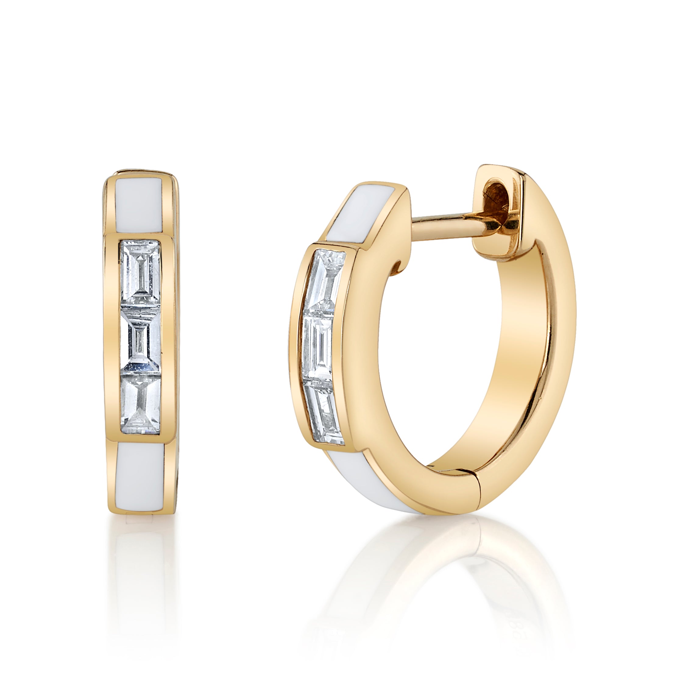 Structured 14k gold huggie with three Diamond baguette stone. Decorating the top and bottom of the huggie is white Enamel.
