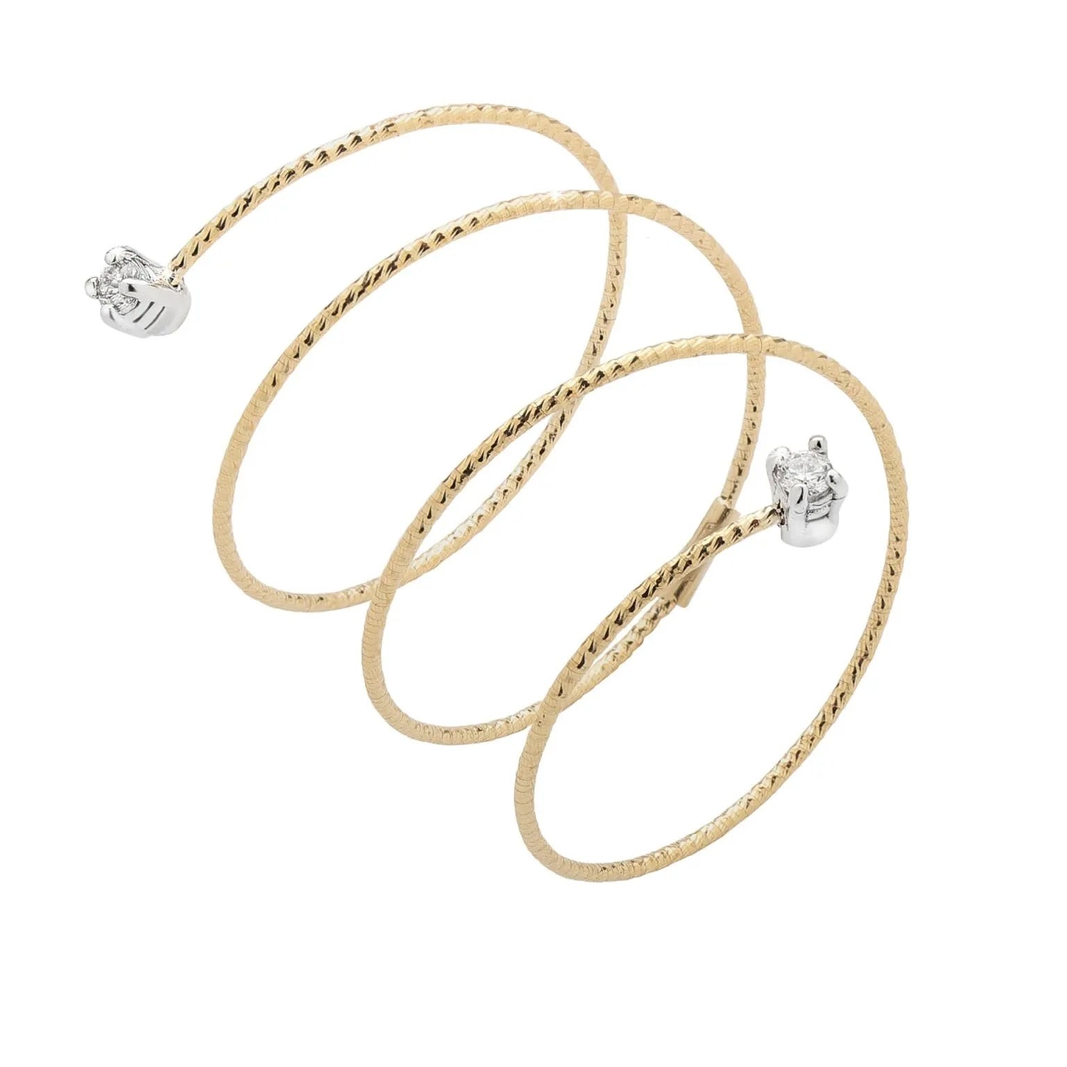 The petite spiral wire ring serves as a conversation starter that adds allure to any wardrobe. Adorned with sparkling .04ct diamonds on both ends, this accessory elevates your style, making a lasting impression. Diamonds are color H-I, Clarity SI.