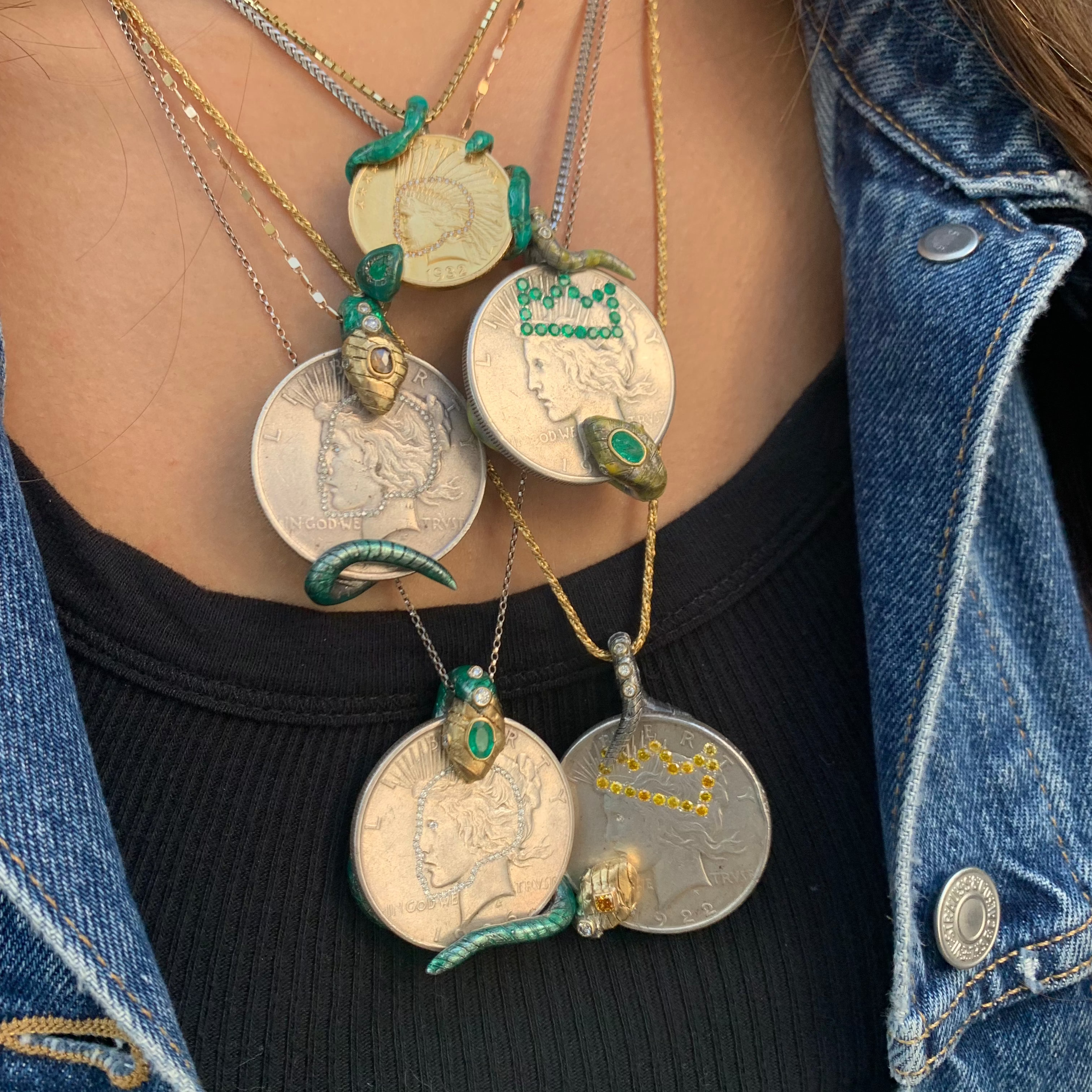 Vintage Sterling Silver Peace Coin with Silver and 18k Yellow Gold snake with Yellow, Brown and White Diamond details. Sold as a pendant only.